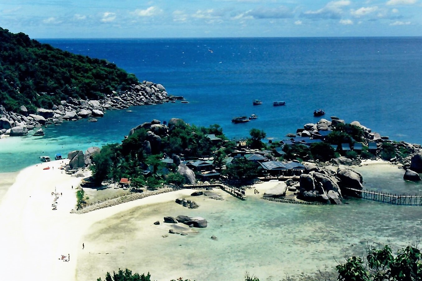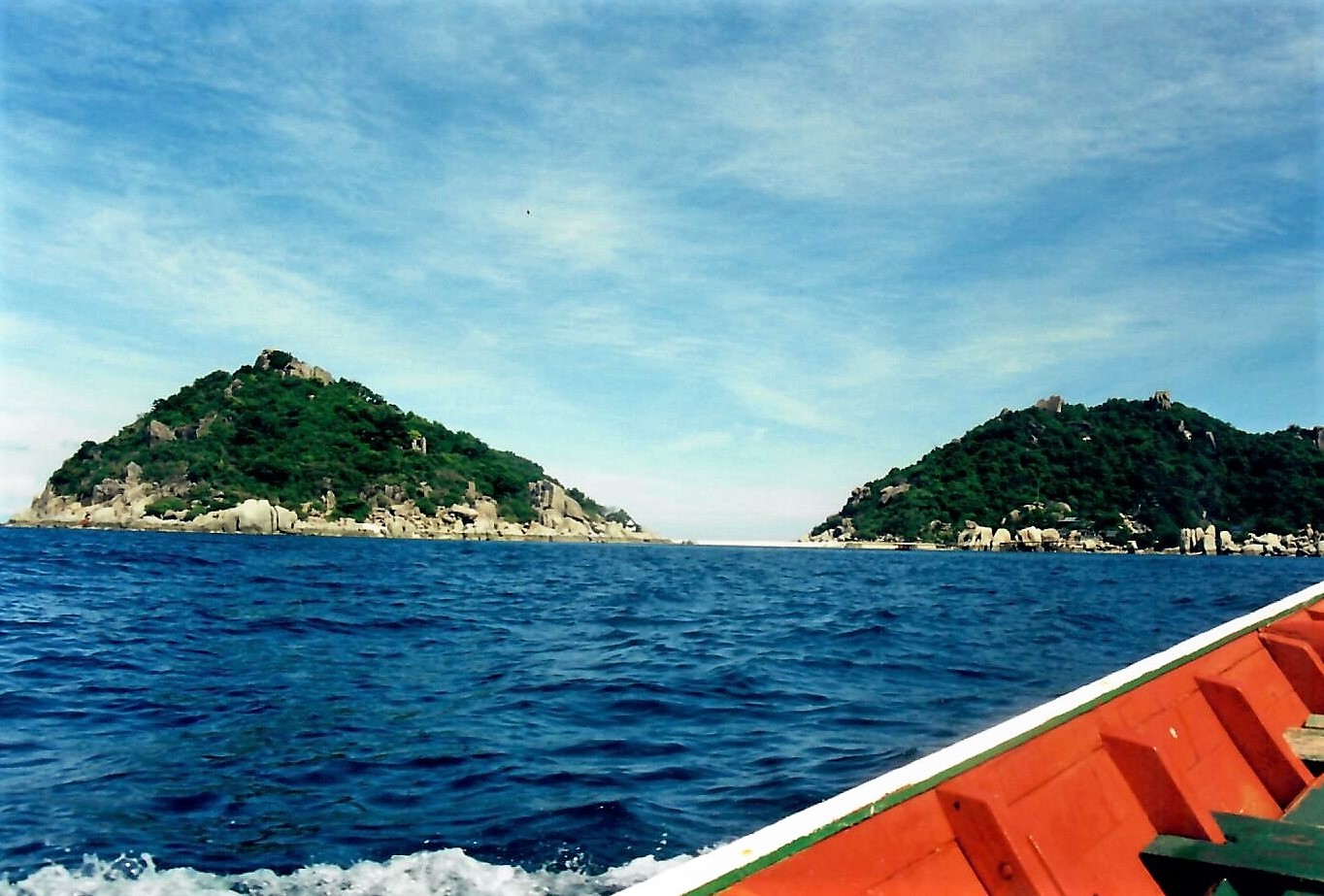 Per la mia permanenza in Thailandia, oltre alle visite in città, aveva organizzato tramite l’agenzia della sorella un bel viaggio per conoscere lo splendido mare del sud. Non quello ormai abusato di Pukhet della costa occidentale o della grande isola di Koh Samui (dove ‘koh’ in tailandese vuol dire ‘isola’), ma quello orientale incontaminato dei parchi marini dell’arcipelago di Chumpon. Stavamo andando a Koh Tao, paradiso dei sub con le sue spiagge sorprendenti come quella di Shark Bay, la baia degli squali, per poi da lì trasferirci sulla piccola Koh Nang Yuan proprio là di fronte. Dalla costa ci arrivammo dopo un paio d’ore diciamo complicate di motoscafo veloce, coi sacchetti pronti appesi intorno a noi.